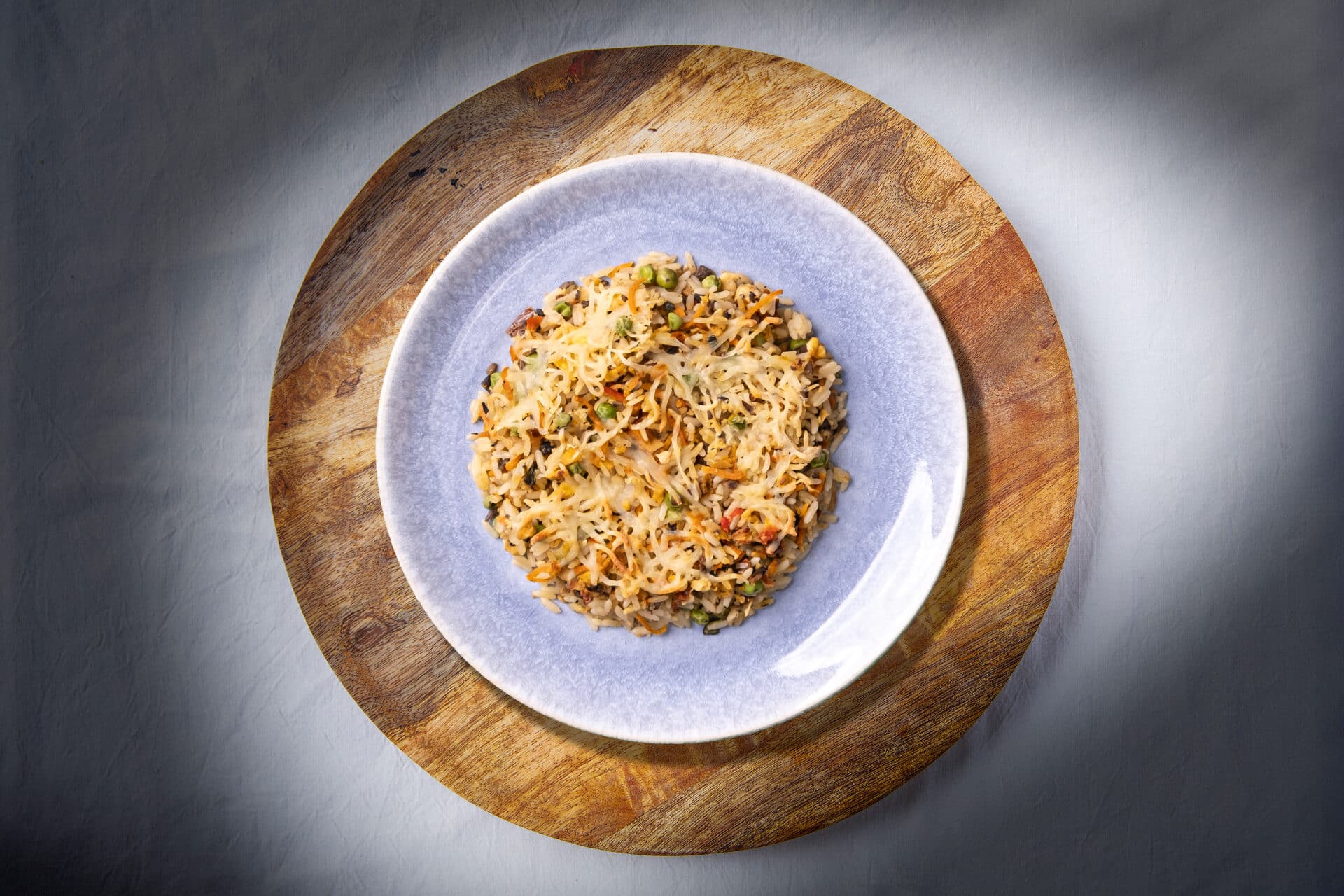 Os legumes são selecionados pela sua frescura e sabor, complementando perfeitamente o arroz, enquanto o ovo e o queijo adicionam uma riqueza de textura e um sabor irresistível. Cada garfada é uma harmoniosa combinação de ingredientes, pensada para melhorar o seu dia e tornar a sua refeição uma verdadeira explosão de sabor.