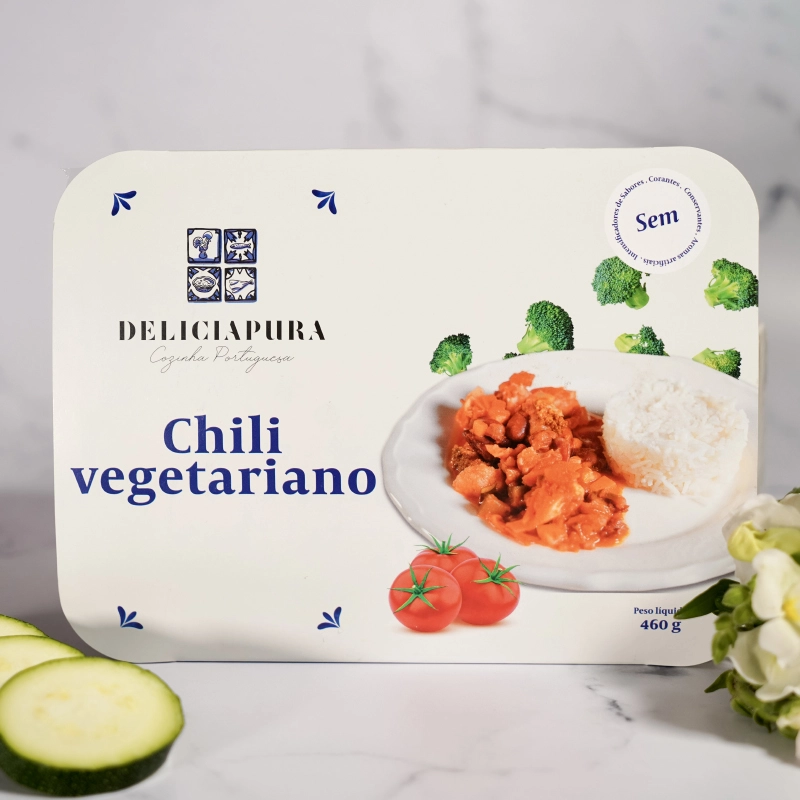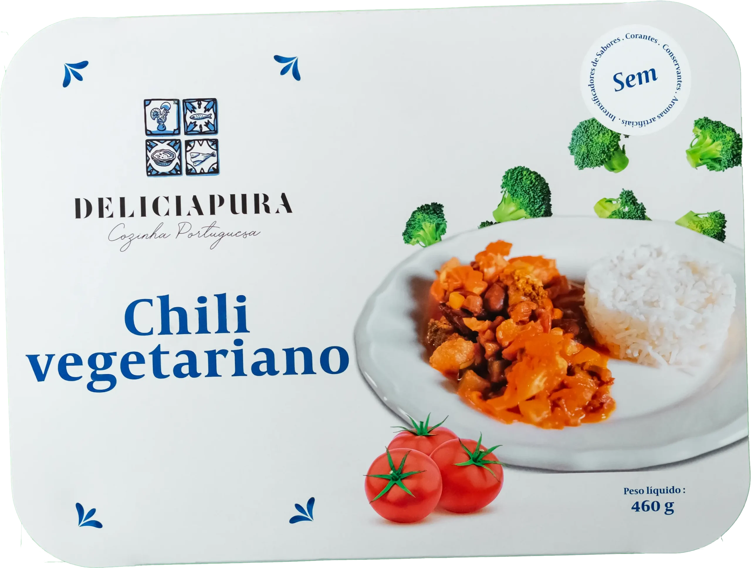 Chili vegetariano (71,7%) (água, courgette (8,8), feijão vermelho (6,7%), molho de tomate caseiro (6,1%) (tomate, azeite, alho, sal, manjericão, orégãos), cenoura (5,9%), beringela (5,3%), pimento vermelho, couve flor (4,1%), cebola, brócolos (2,5%), azeite, vinho branco (SULFITOS), alho, sal, malagueta, paprika), arroz basmati cozido, (28,3%) ( água, arroz basmati branco (9,7%), azeite, cebola, sal).