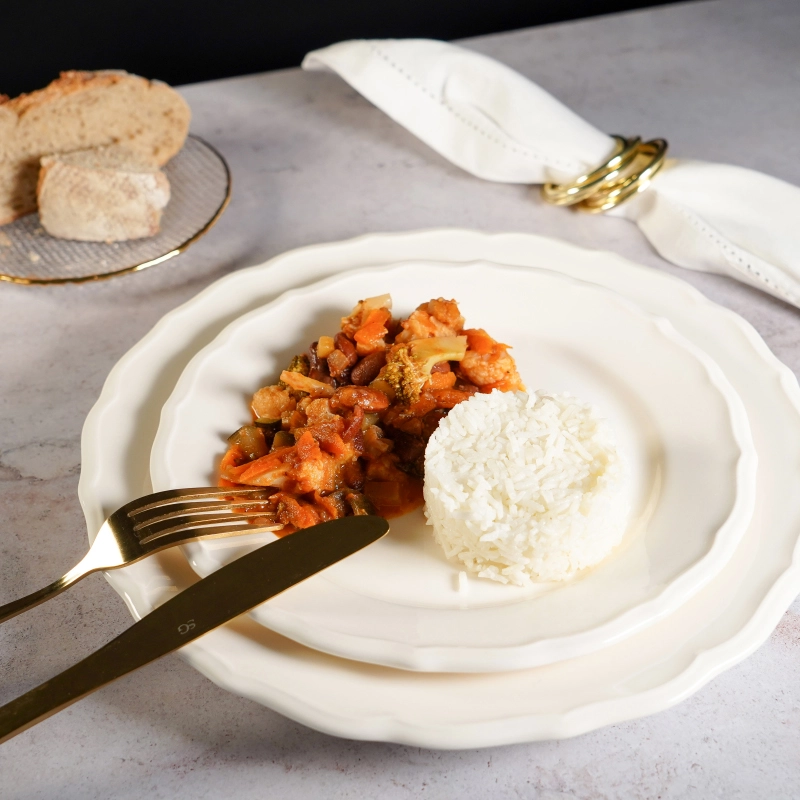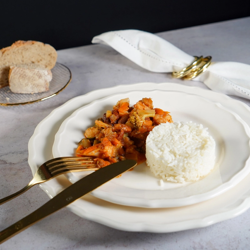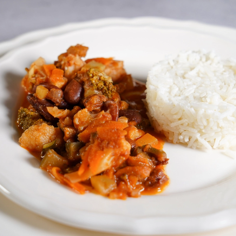 Este prato de Chili Vegetariano com Arroz Basmati é a escolha perfeita para quem procura uma refeição deliciosa e nutritiva, preparada com ingredientes frescos e saudáveis. O chili vegetariano é cuidadosamente preparado com feijão vermelho, cenoura, beringela, pimento vermelho e cebolas, todos envolvidos numa rica e cremosa base de molho de tomate caseiro.