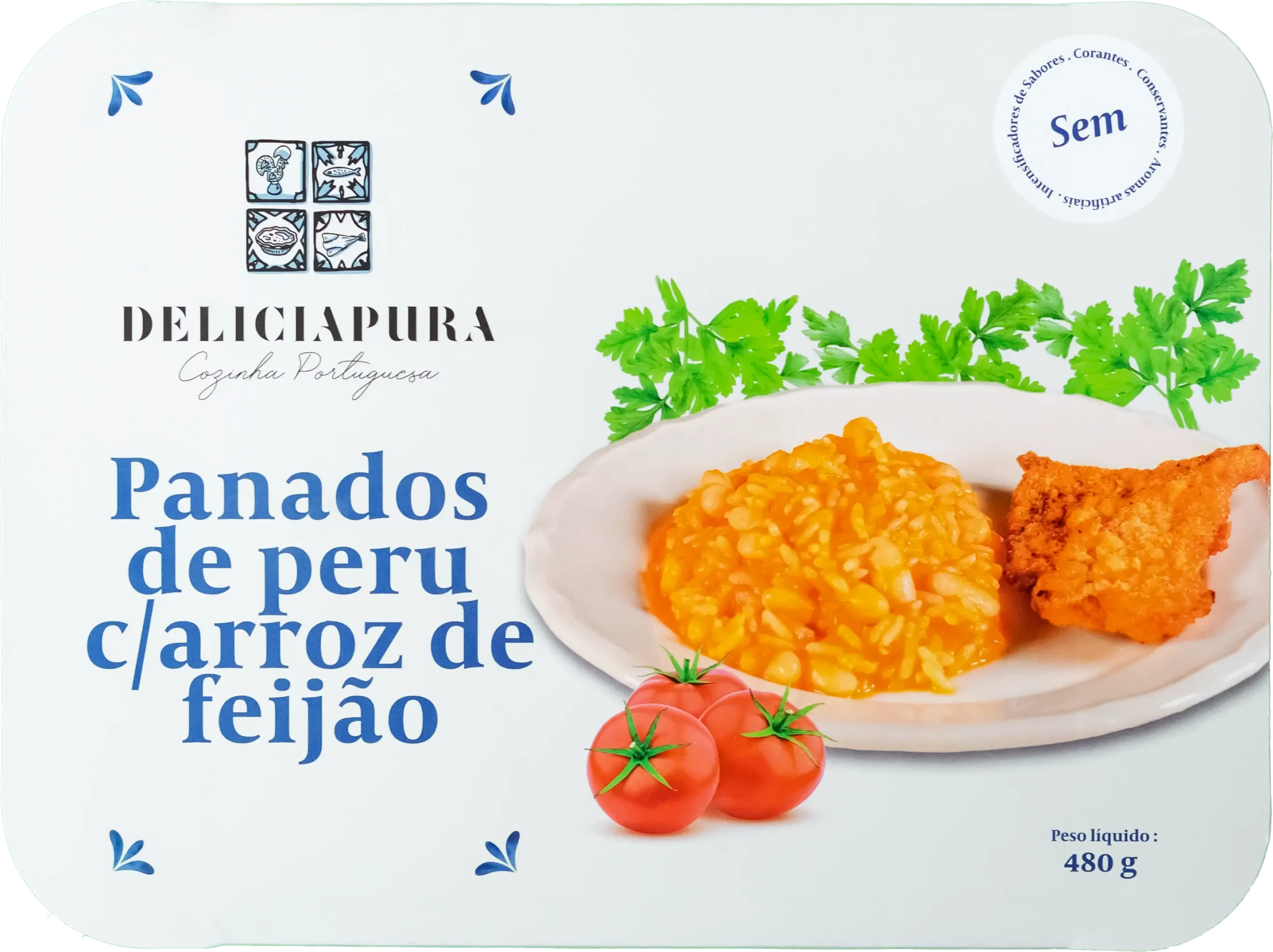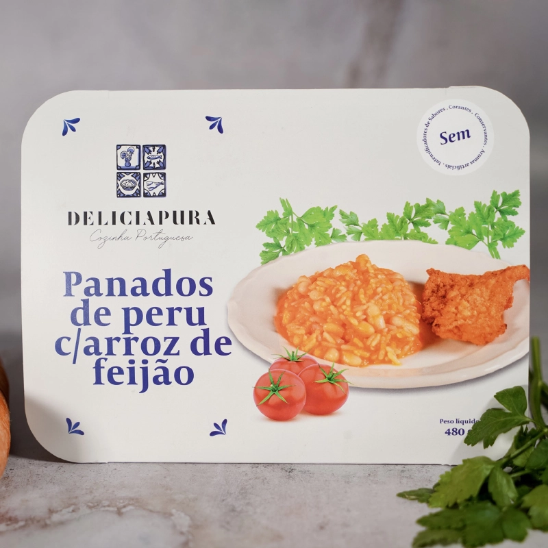 Dose individual com 480g de Panados de Peru com Arroz de Feijão – ultracongelado.
