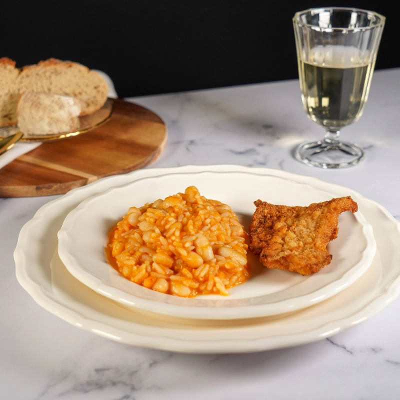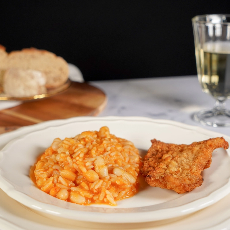 O arroz de feijão é preparado com um caldo de legumes caseiro, que realça o sabor natural dos ingredientes. Cozinhado até ficar solto e al dente, o arroz vaporizado envolve cada grão de feijão branco, resultando numa textura perfeita que agrada ao paladar.