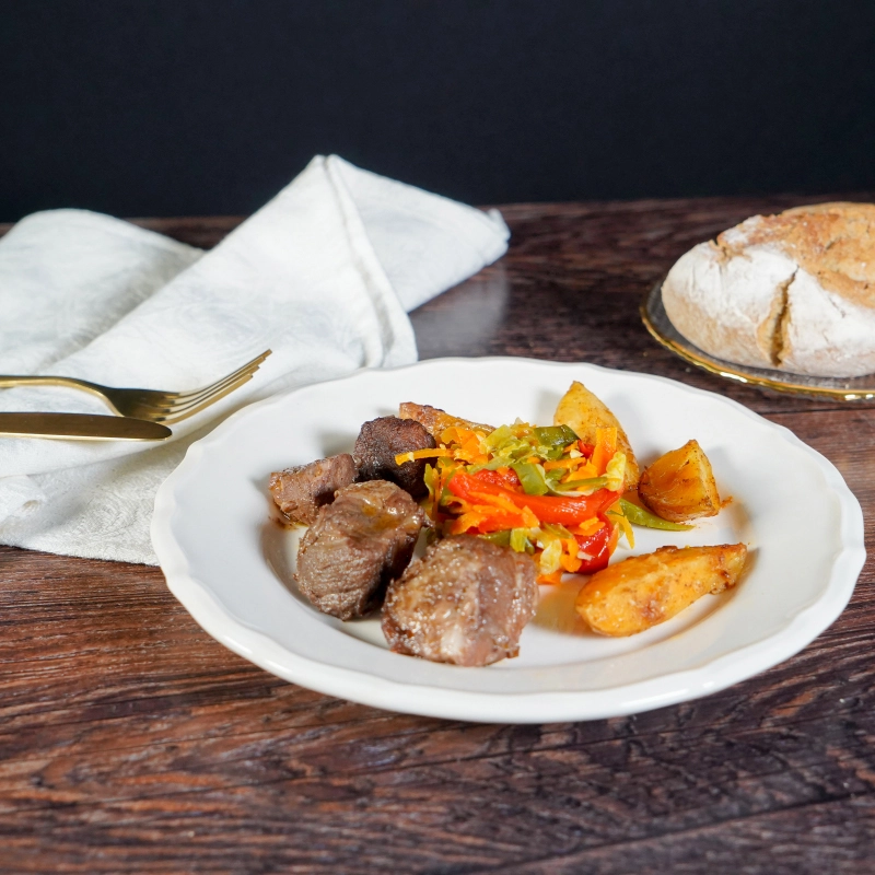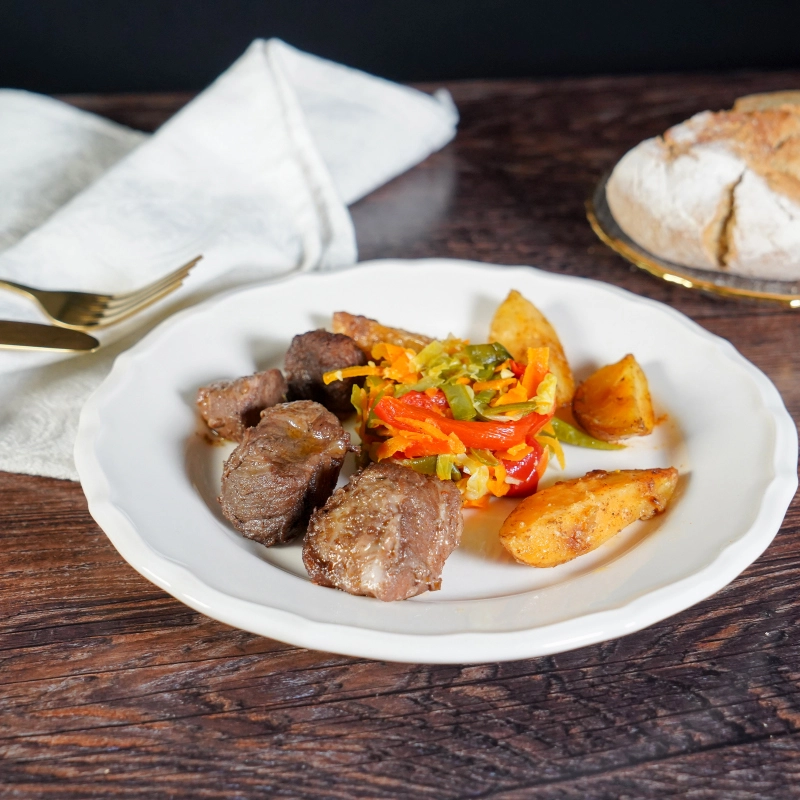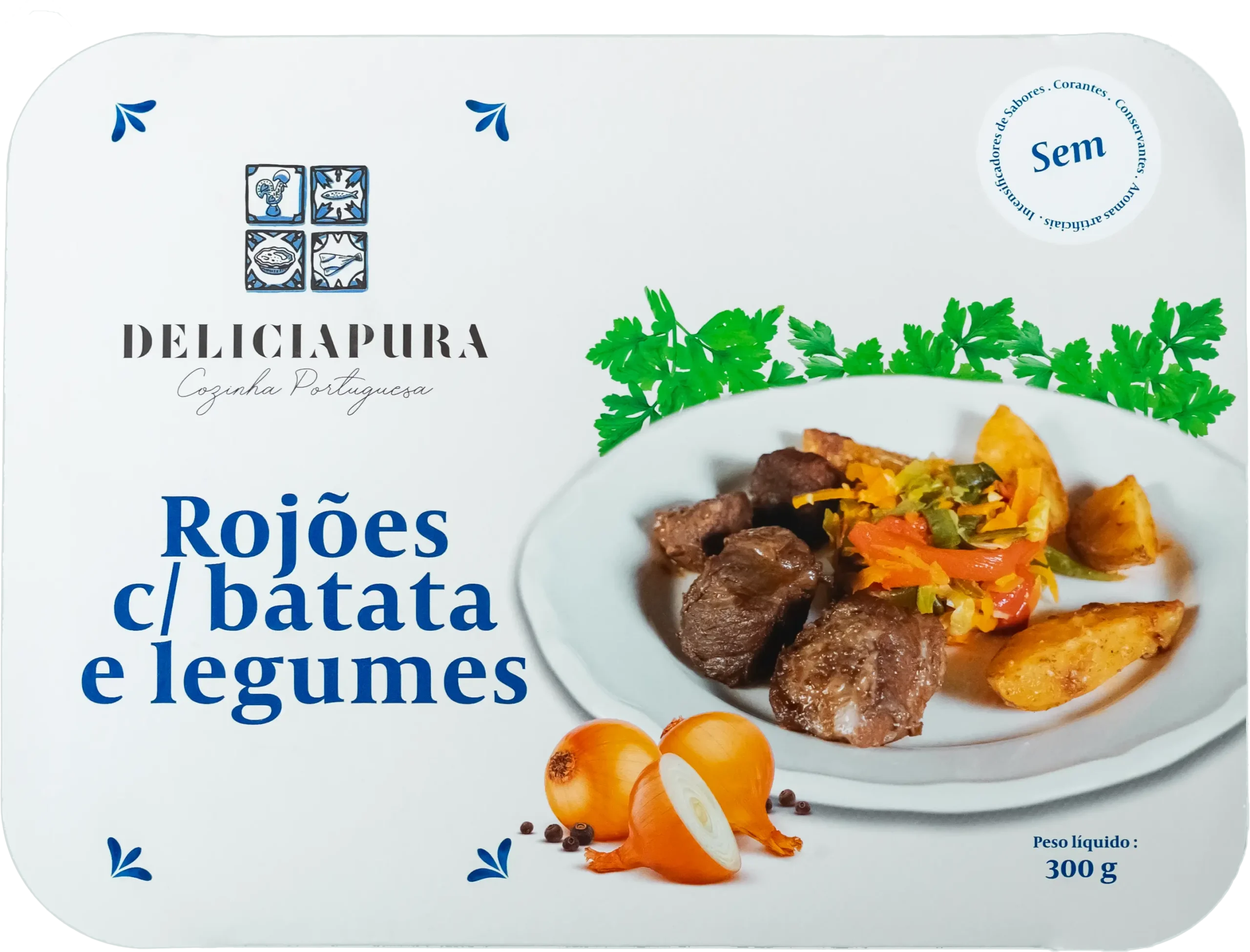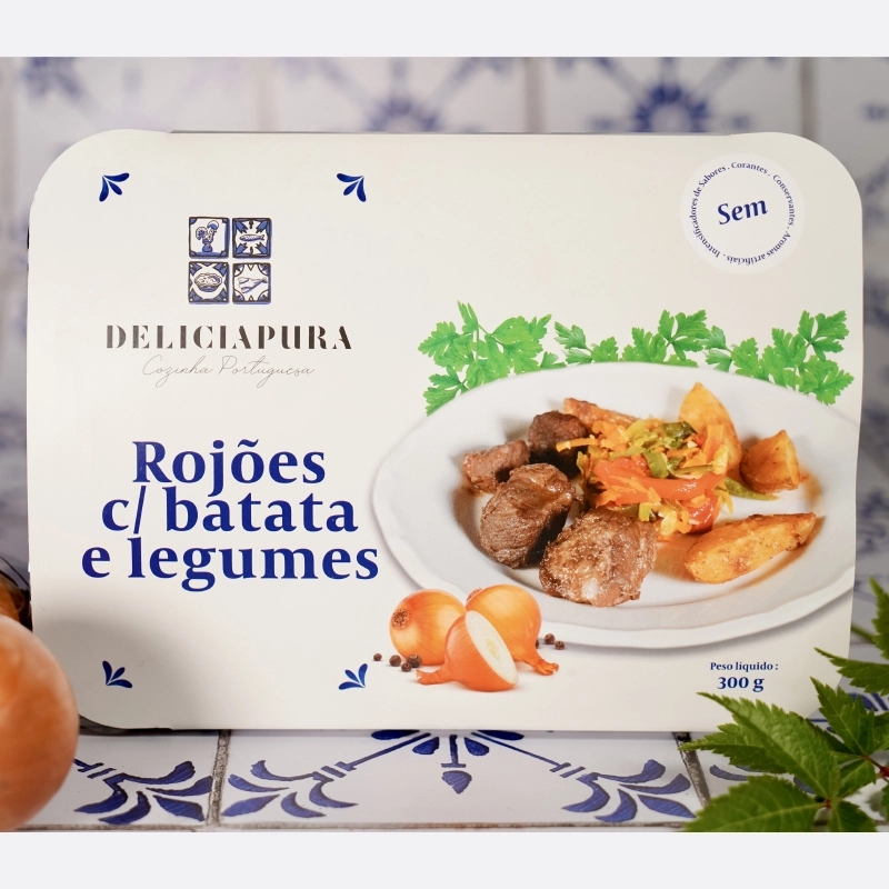 Dose individual com 300g de Rojões com batata á Padeiro e Legumes – ultracongelado.