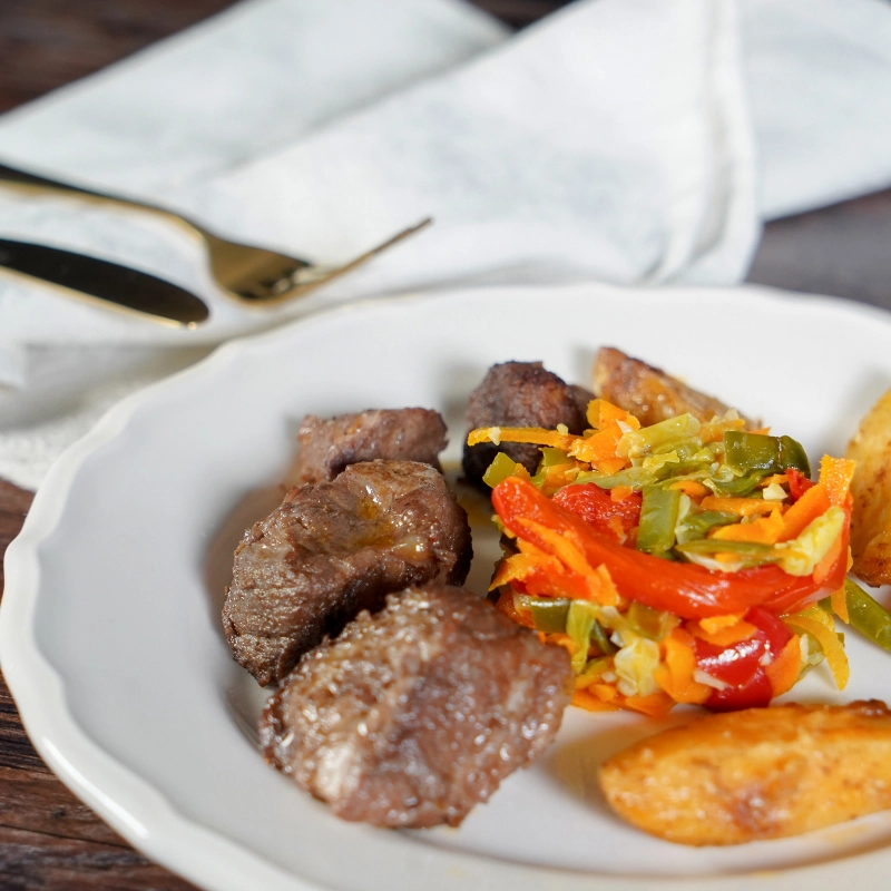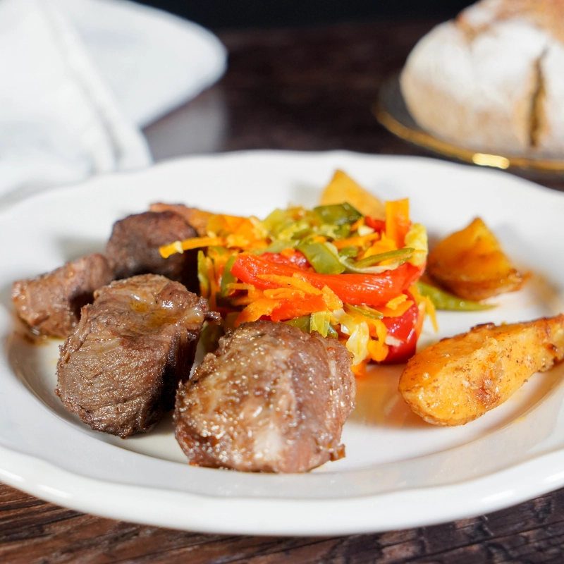 Descubra a rica tradição da gastronomia portuguesa com o nosso prato de Rojões com Batata e Legumes, uma refeição reconfortante e cheia de sabor que o transportará diretamente para a região do Minho.